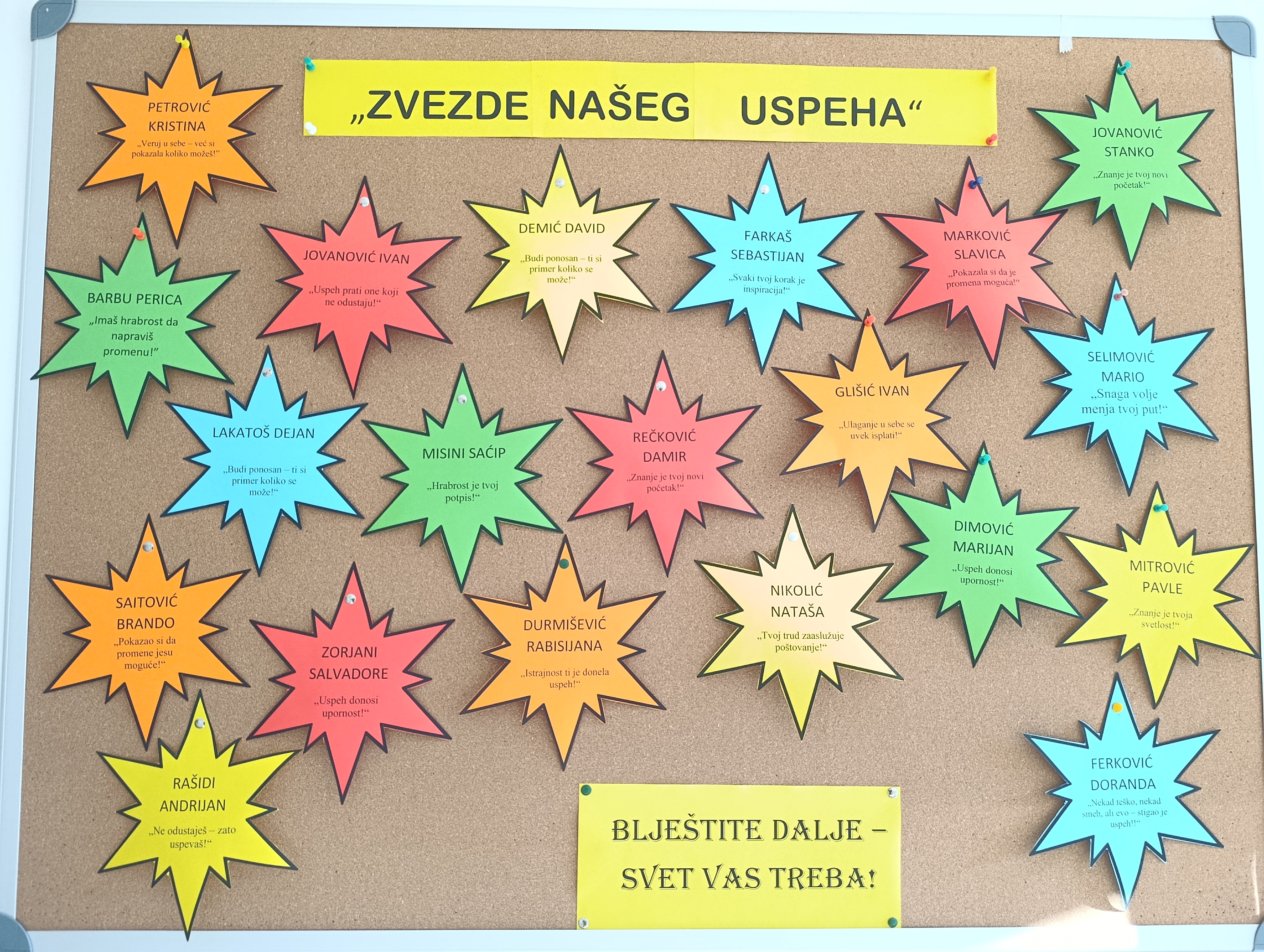 На крају првог полугодишта у школи је постављен пано „Звезде нашег успеха“, посвећен најуспешнијим полазницима који су се истакли својим трудом, упорношћу и постигнутим резултатима у учењу. На паноу су истакнута имена полазника, уз мотивационе поруке које симболично представљају њихов напредак и лични успех.
