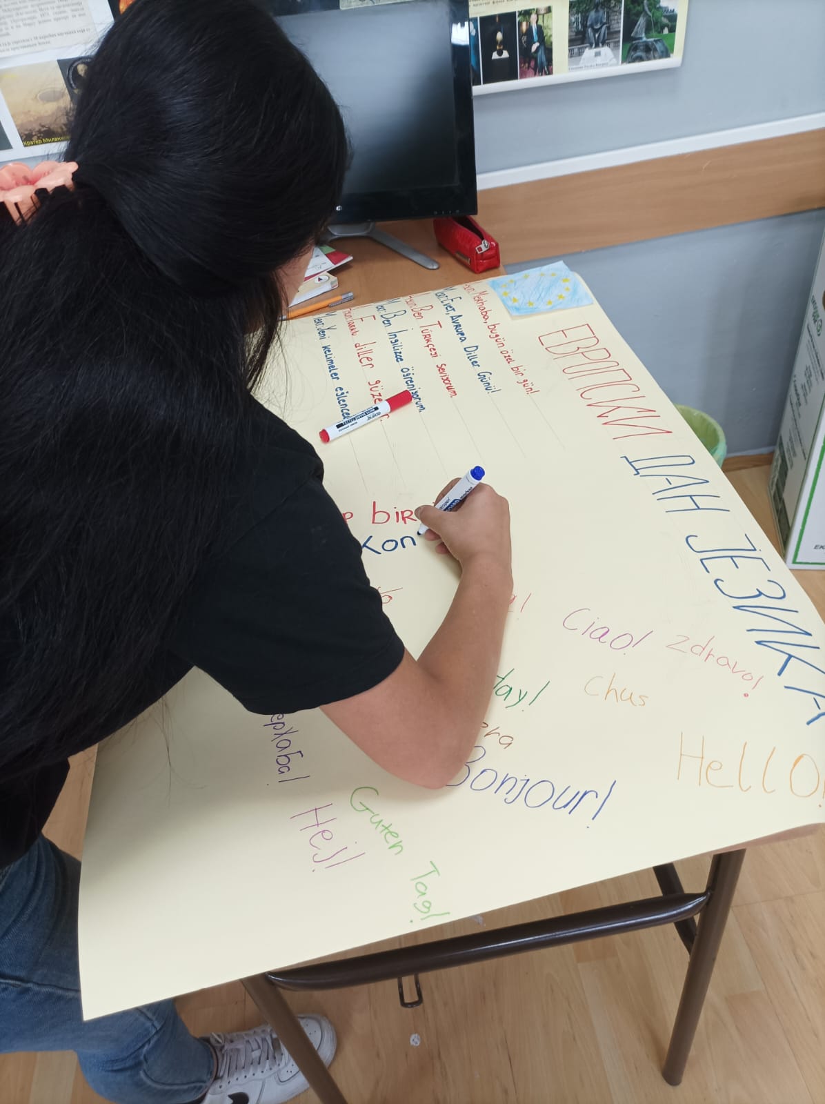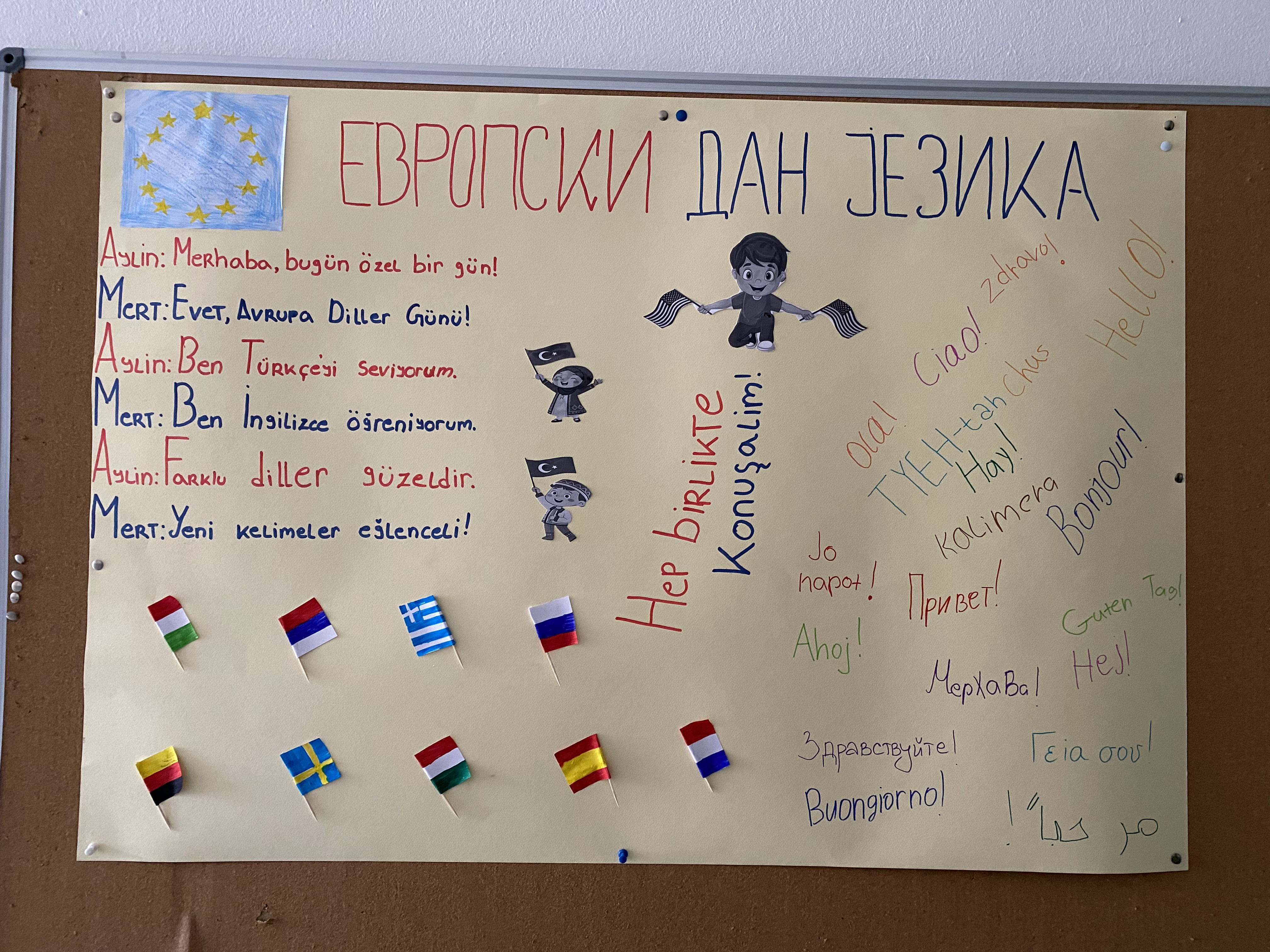 Полазници су имали прилику да испишу поздраве на различитим језицима, који су затим изложени на паноу у ходнику школе. На тај начин створен је шаролик и живописан кутак који је симболизовао богатство култура и језика Европе.