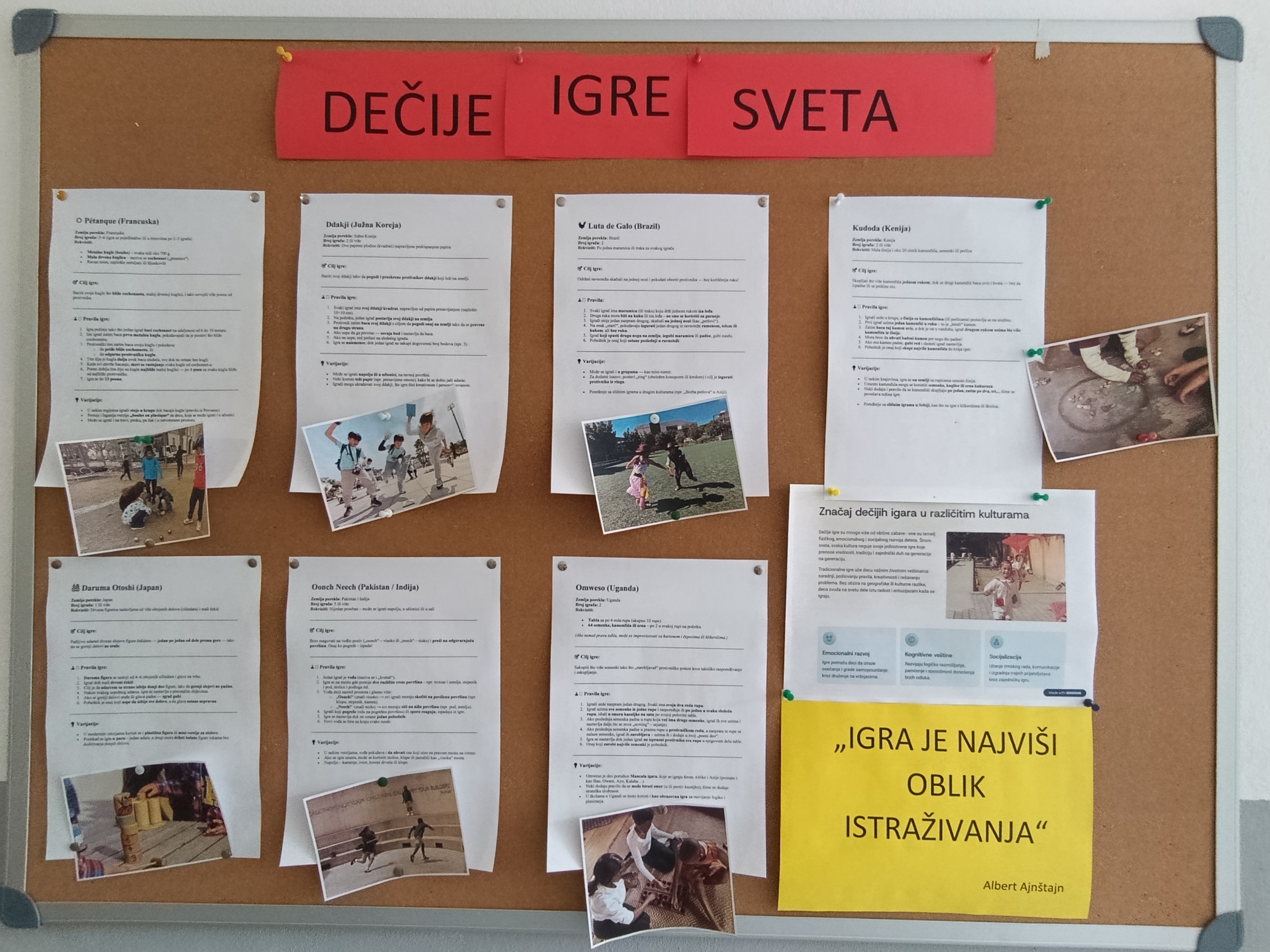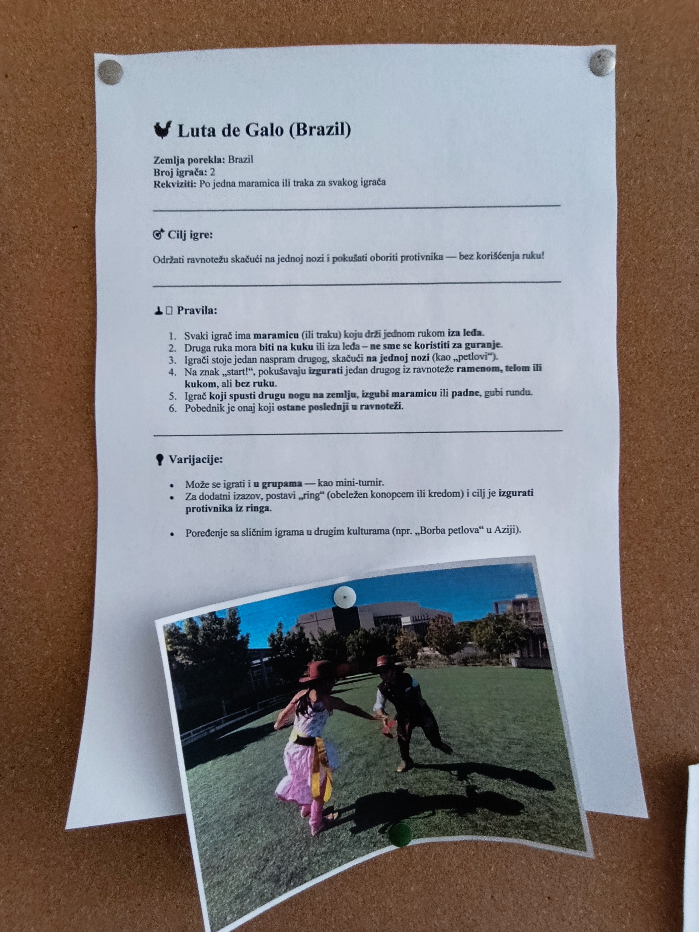На часовима географије и одговорног живљења у грађанском друштву одржана је креативна и едукативна радионица под називом „Игре из детињства широм света“. Циљ радионице био је да се полазници подсете значаја игре у детињству и да открију како се деца широм света забављају, друже и уче кроз игру. Уз помоћ наставних материјала, фотографија и презентација, учесници су се упознали са правилима, симболиком и културним значењем игараиз различитих земаља — од бразилске Luta de Galo, преко јапанске Daruma Otoshi, до француске игре Pétanque. Полазници су истакли да им је овај час био забаван и користан, јер су кроз игру учили о свету и културама које до сада нису познавали. Већина је нагласила да су се осетили као деца и да су кроз тимски рад научили нешто ново о сарадњи и поштовању различитости. На крају радионице су закључили да је „игра универзални језик који повезује људе без обзира на године, језик или порекло“.
