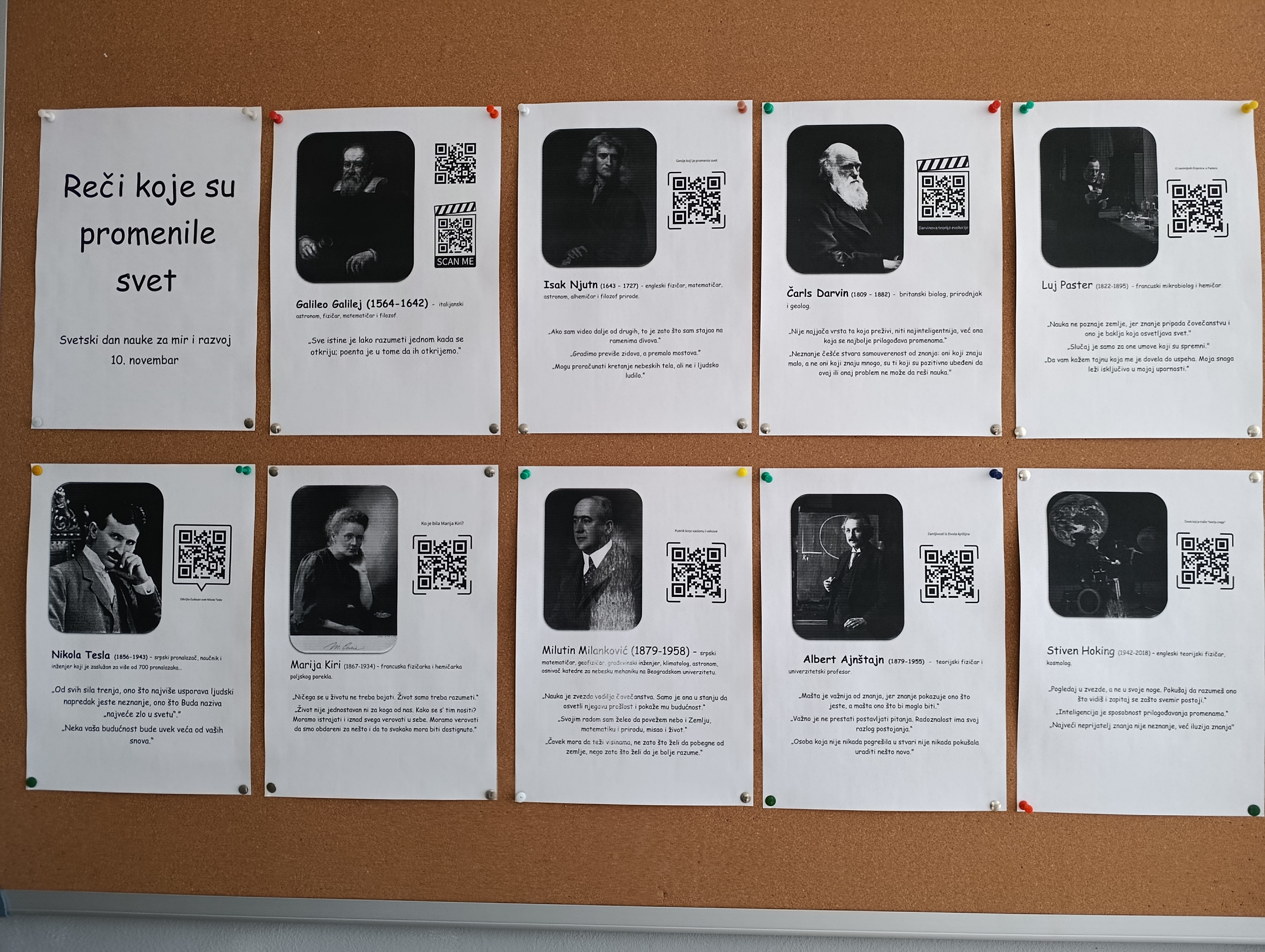 На часовима природних наука полазници су разговарали о значају науке у савременом друштву и њеном доприносу миру и развоју,али и о томе колики је утицај науке на наш живот и колико је важно развијати критичко мишљење кад су идеје развоја технологије и напретка у питању.Уз помоћ наставника,полазници су се упознали са животом и радом познатих научника,а након тога направили пано "Речи које су промениле свет".
